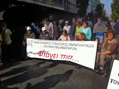 «Φτάνει πια! Την κρίση την πληρώνουν αυτοί που δεν φταίνε, οι πλέον ευάλωτοι, οι φτωχότεροι των φτωχών, τα άτομα με αναπηρία και οι οικογένειές τους» αναφέρεται σε σχετική ανακοίνωση της Εθνική Συνομοσπονδία Ατόμων με Αναπηρία.