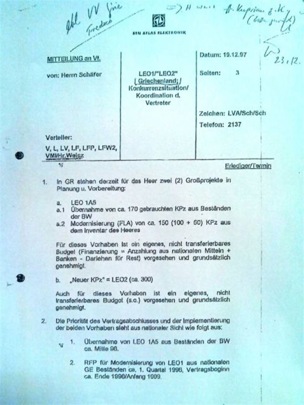 Ο συντάκτης του ενημερωτικού σημειώματος είναι ο κατηγορούμενος και στη Γερμανία για δωροδοκίες στην Ελλάδα Schäfer και απευθύνεται σε άλλους κατηγορουμένους για δωροδοκίες συναδέλφους του, όπως οι H. Kuprian και Weisz. Αίσθηση προκαλεί η επισήμανση για το πώς οι γερμανικές εταιρείες πρέπει να ενώσουν τις δυνάμεις τους για να προωθήσουν τα προγράμματα των Leoprard 1 και 2, αφού υπάρχει ανταγωνισμός στις προμήθειες από τις ΗΠΑ, τη Γαλλία και τη Βρετανία. Μάλιστα αναφέρεται ότι «η έναρξη της σύμβασης των Leoprard 2 συμπεριλαμβάνει την ολοκλήρωση της σύμβασης παράδοσης της αντισταθμιστικής σύμβασης και των χρηματοδοτικών συμφωνιών με τις τράπεζες».