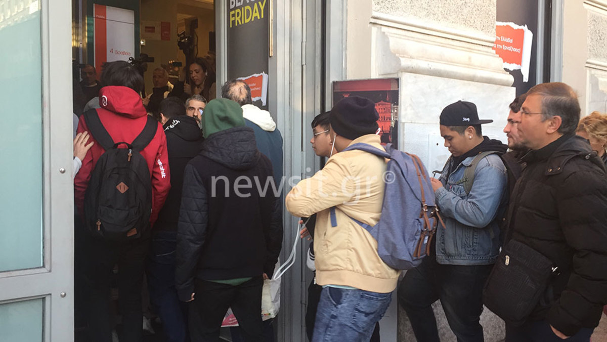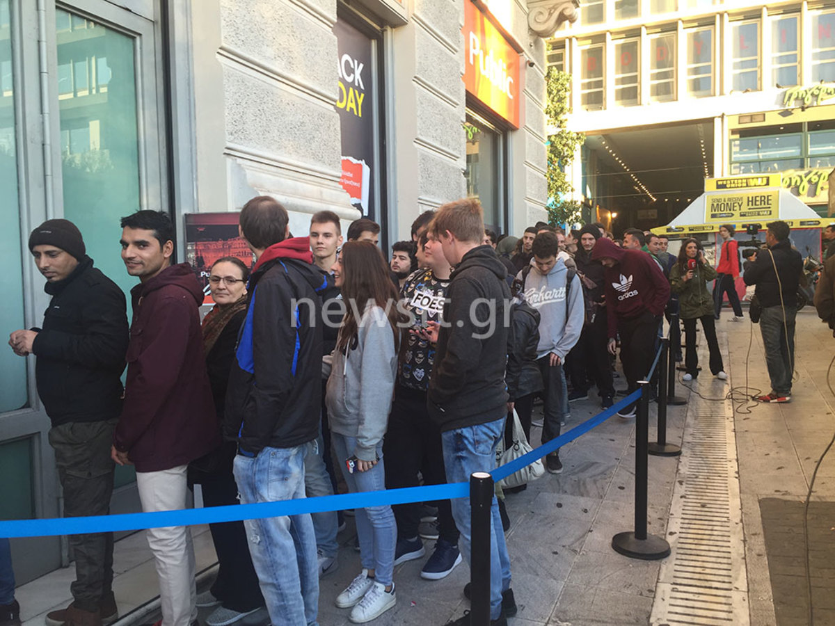 Άνθρωποι, κυρίως νεαροί, στην ουρά, περιμένουν να αγοράσουν κινητά, παιχνιδομηχανές και ό,τι άλλο μπορεί να φανταστεί κανείς και είναι σε προσφορά.