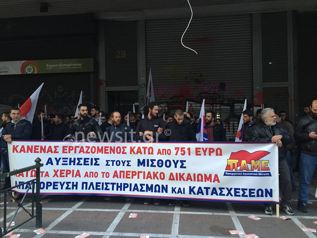 Ζητούν κατώτατο μισθό 751 ευρώ, αυξήσεις μισθών και απαγόρευση πλειστηριασμών και κατασχέσεων.
