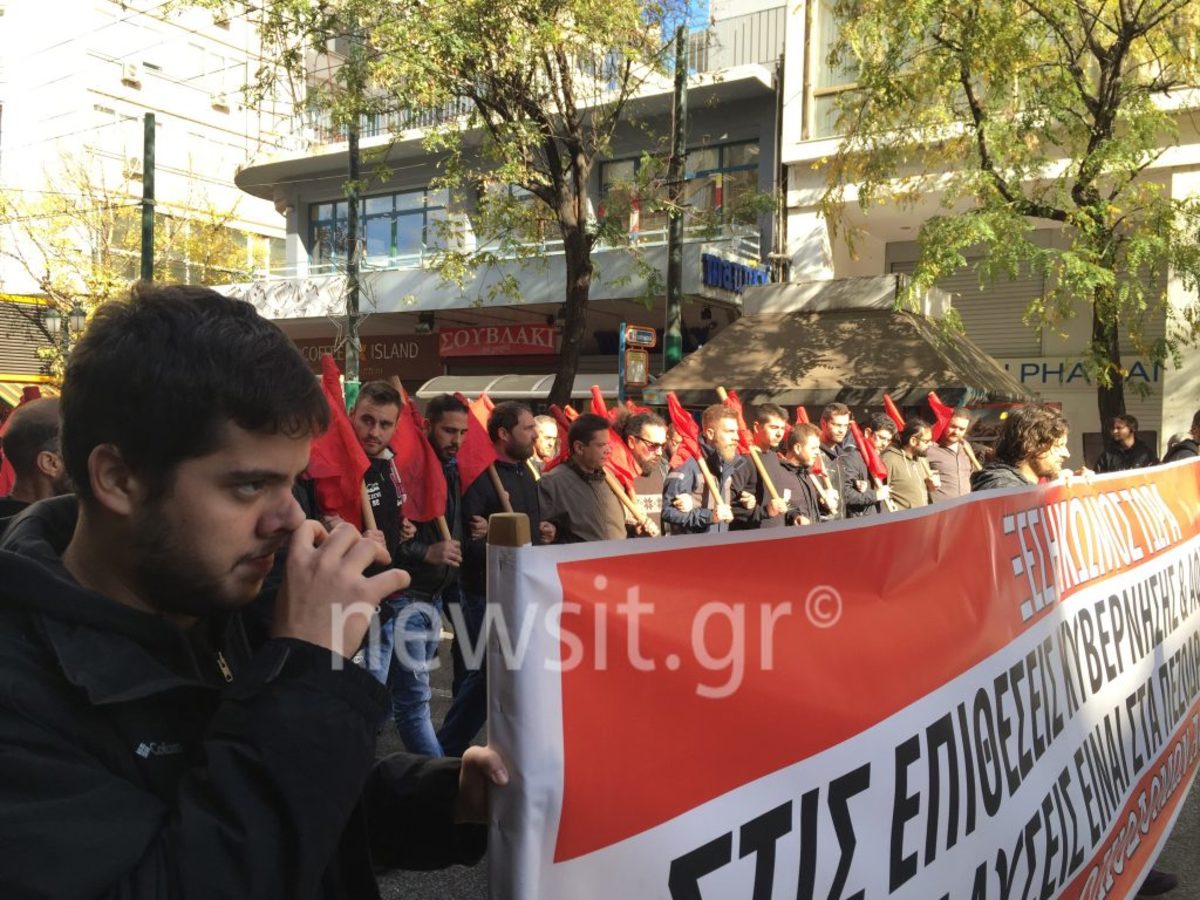 Δυναμικό παρόν δίνουν τα μέλη του ΠΑΜΕ. Μετά από μια μαζική συγκέντρωση στην Ομόνοια, ξεκίνησε λίγο μετά τις 12:00 η πορεία προς το Σύνταγμα.
