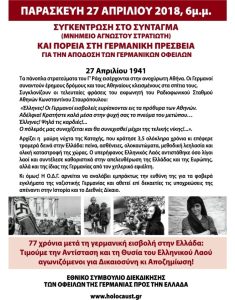 Σήμερα Παρασκευή 27 Απρίλη 2018, στις 6.00 μ.μ. Το Εθνικό Συμβούλιο Διεκδίκησης των Οφειλών της Γερμανίας προς την Ελλάδα και η Πανελλήνια Ένωση Αγωνιστών Εθνικής Αντίστασης – Δημοκρατικού Στρατού Ελλάδας (ΠΕΑΕΑ-ΔΣΕ) οργανώνουνΣυγκέντρωση Τιμής στην Αντίσταση και τη Θυσία τους Ελληνικού Λαού, στο Σύνταγμα, και Πορεία στη Γερμανική Πρεσβεία απαιτώντας και διεκδικώντας τηνΑπόδοση των Γερμανικών Οφειλών.