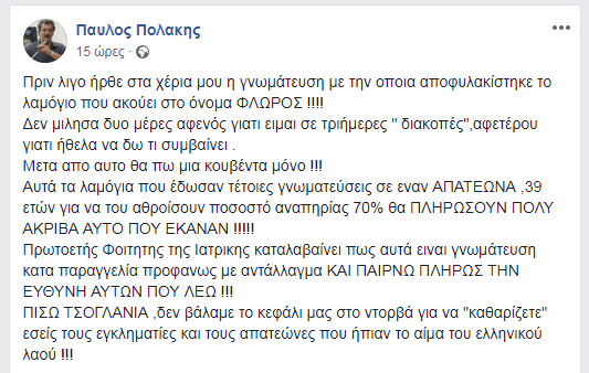 1) Τη γνωμάτευση με την οποία αποφυλακίστηκε, όπως τη δημοσίευσε χθες το βράδυ στο facebook, ο αναπληρωτής υπουργός Υγείας, κύριος Παύλος Πολάκης.