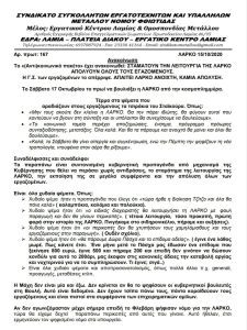 Το Συνδικάτο Συγκολλητών Εργατοτεχνιτών και Υπαλλήλων Μετάλλου Νομού Φθιώτιδας, με σημερινή Ανακοίνωσή του καλεί τους εργαζόμενους να «το Σάββατο 17 Οκτωβρίου το πρωί να βουλιάξει η ΛΑΡΚΟ από την κοσμοπλημμύρα: